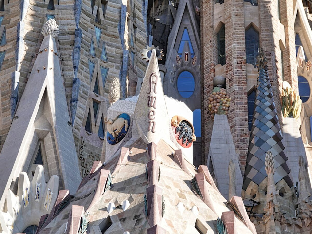 At the appointed time, we returned to the meeting point and joined the group for the tour. Sagrada Familia was started in 1882 and "will be completed in ten years", for the past 50 years or so. It just keeps going. The final facade that documents the Glory is still under construction. The initial plans for another park and pod face challenges as there are buildings there and opposition to tearing them down.