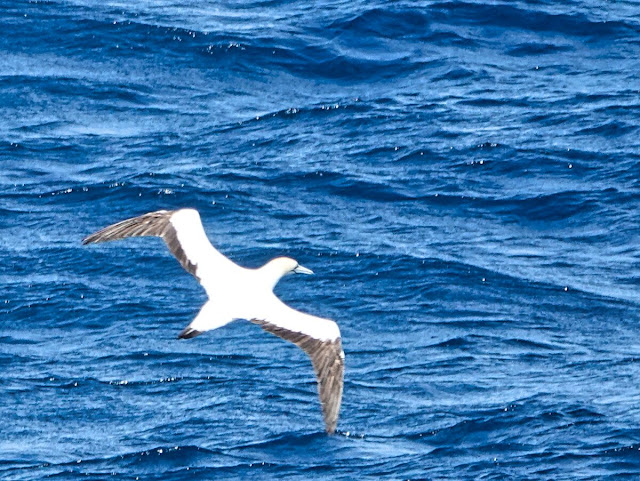 There was more aviary action this afternoon with boobies zipping along the ship. Well, I thought they were boobies. Plus, that made the title of this blog work. But, a little research showed that they are more likely Cape Gannets. Boobies and Gannets are all part of the Sulidae family of birds. The big difference is that Boobies live in tropical waters whereas Gannets live in more temperate climates. They all fish by diving after small prey. I think it is a scheme by Big Ornithology. :-)